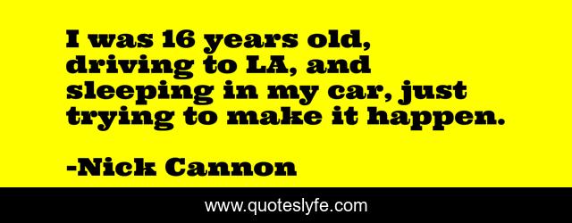 This page presents the quote "I was 16 years old, driving to LA, and sleeping in my car, just trying to make it happen.". Author of this quote is Nick Cannon. This quote is about make it happen, driving,.