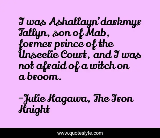 This page presents the quote "I was Ashallayn’darkmyr Tallyn, son of Mab, former prince of the Unseelie Court, and I was not afraid of a witch on a broom.". Author of this quote is Julie Kagawa, The Iron Knight. This quote is about fear, ash, witch, honor,.