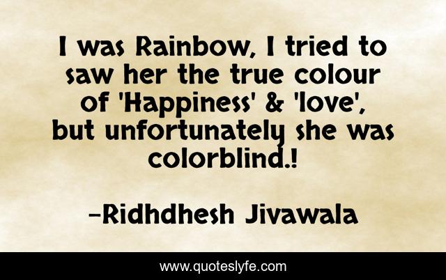 This page presents the quote "I was Rainbow, I tried to saw her the true colour of 'Happiness' & 'love', but unfortunately she was colorblind.!". Author of this quote is Ridhdhesh Jivawala. This quote is about care, love, life-lessons, affection, thoughts-from-my-heart,.