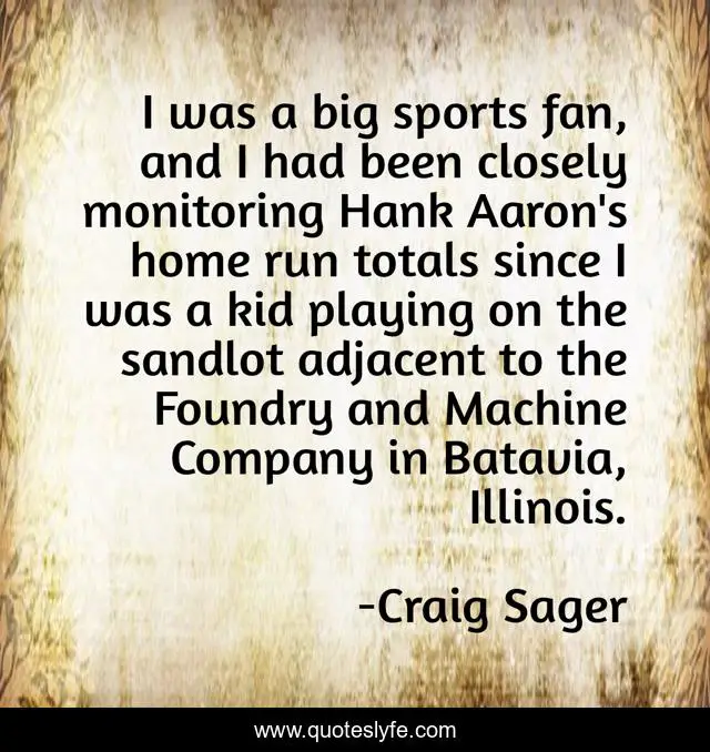This page presents the quote "I was a big sports fan, and I had been closely monitoring Hank Aaron's home run totals since I was a kid playing on the sandlot adjacent to the Foundry and Machine Company in Batavia, Illinois.". Author of this quote is Craig Sager. This quote is about home, company, run,.