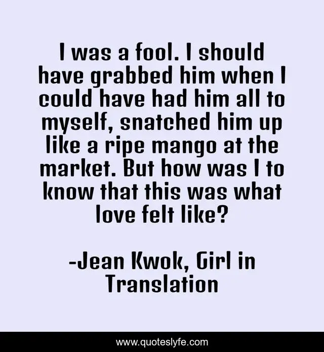 This page presents the quote "I was a fool. I should have grabbed him when I could have had him all to myself, snatched him up like a ripe mango at the market. But how was I to know that this was what love felt like?". Author of this quote is Jean Kwok, Girl in Translation. This quote is about relationships, heart-ache, heartbreak, love, affection,.