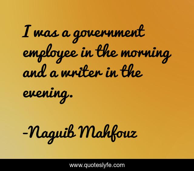 This page presents the quote "I was a government employee in the morning and a writer in the evening.". Author of this quote is Naguib Mahfouz. This quote is about employee, government,.