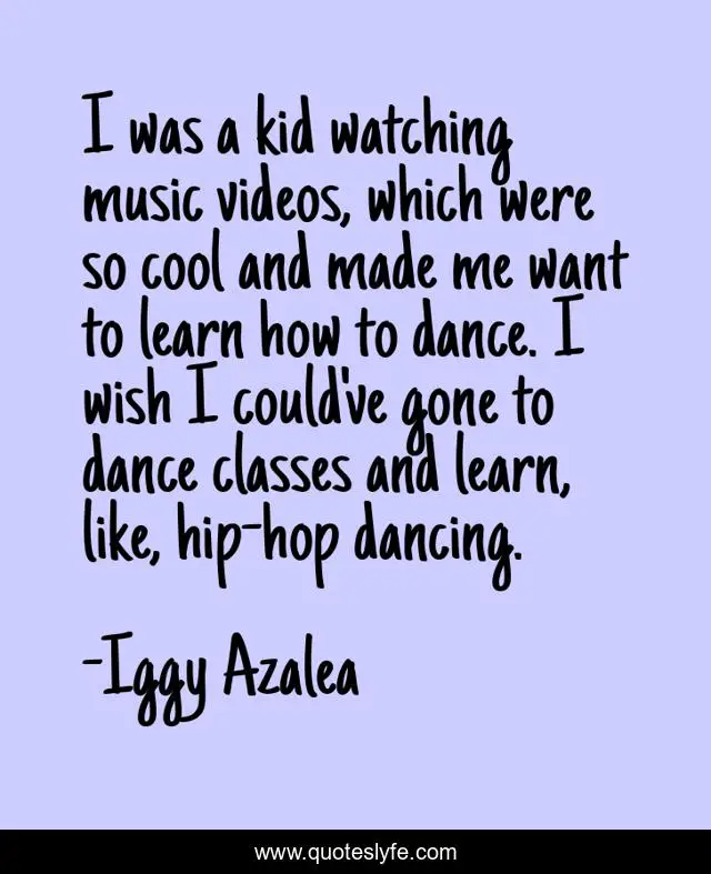 This page presents the quote "I was a kid watching music videos, which were so cool and made me want to learn how to dance. I wish I could've gone to dance classes and learn, like, hip-hop dancing.". Author of this quote is Iggy Azalea. This quote is about dance, me, music,.