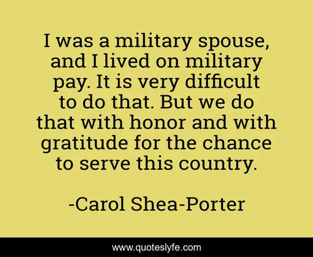 This page presents the quote "I was a military spouse, and I lived on military pay. It is very difficult to do that. But we do that with honor and with gratitude for the chance to serve this country.". Author of this quote is Carol Shea-Porter. This quote is about gratitude, military, honor,.