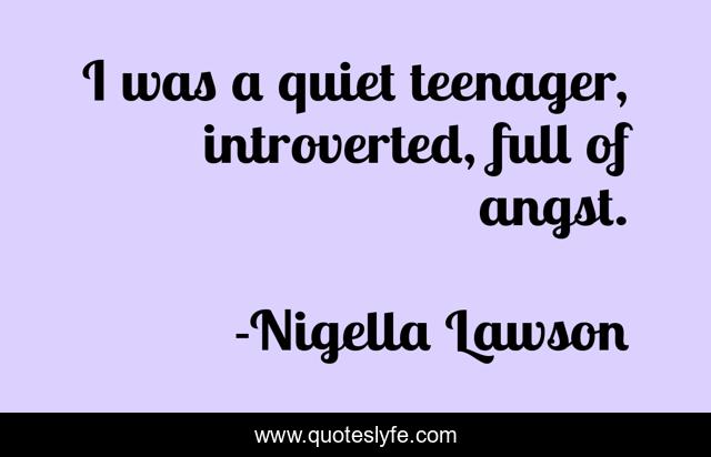 This page presents the quote "I was a quiet teenager, introverted, full of angst.". Author of this quote is Nigella Lawson. This quote is about angst, full, quiet,.