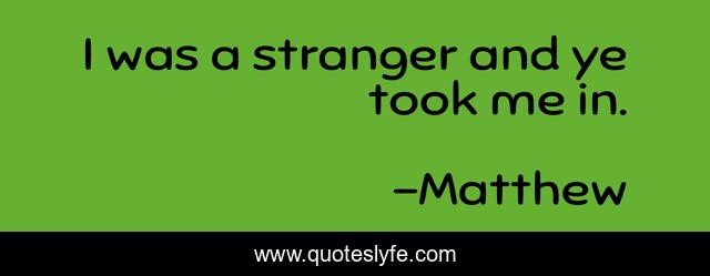 This page presents the quote "I was a stranger and ye took me in.". Author of this quote is Matthew. .