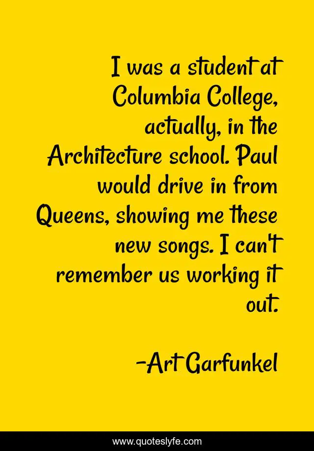 This page presents the quote "I was a student at Columbia College, actually, in the Architecture school. Paul would drive in from Queens, showing me these new songs. I can't remember us working it out.". Author of this quote is Art Garfunkel. This quote is about me, school, college,.