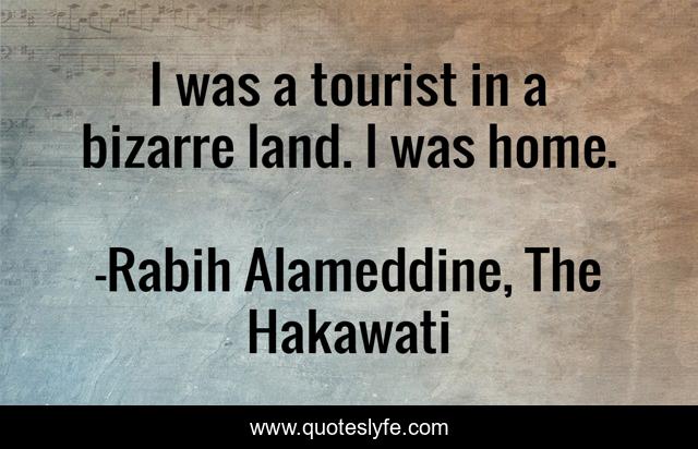 This page presents the quote "I was a tourist in a bizarre land. I was home.". Author of this quote is Rabih Alameddine, The Hakawati. This quote is about home, loneliness, community, family,.