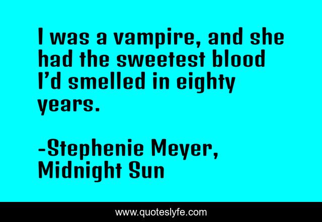 This page presents the quote "I was a vampire, and she had the sweetest blood I’d smelled in eighty years.". Author of this quote is Stephenie Meyer, Midnight Sun. This quote is about twilight-saga, edward-cullen, bella-swan, midnight-sun, vampire, romance, twilight,.