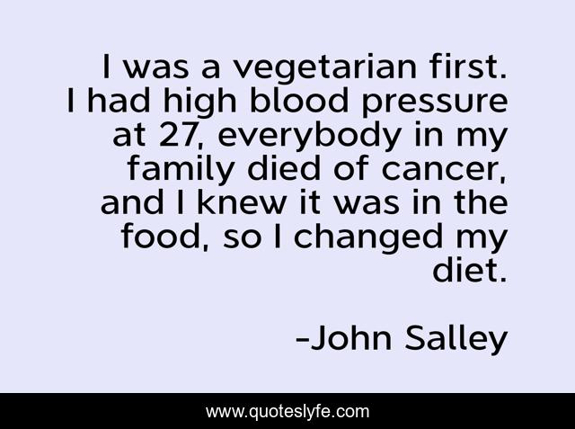 This page presents the quote "I was a vegetarian first. I had high blood pressure at 27, everybody in my family died of cancer, and I knew it was in the food, so I changed my diet.". Author of this quote is John Salley. This quote is about food, pressure, family,.