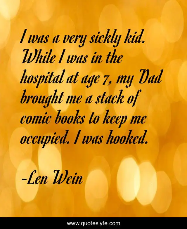 This page presents the quote "I was a very sickly kid. While I was in the hospital at age 7, my Dad brought me a stack of comic books to keep me occupied. I was hooked.". Author of this quote is Len Wein. This quote is about me, hospital, kid,.