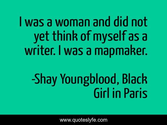 This page presents the quote "I was a woman and did not yet think of myself as a writer. I was a mapmaker.". Author of this quote is Shay Youngblood, Black Girl in Paris. This quote is about writer, writers, traveling,.