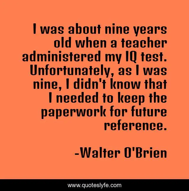 This page presents the quote "I was about nine years old when a teacher administered my IQ test. Unfortunately, as I was nine, I didn't know that I needed to keep the paperwork for future reference.". Author of this quote is Walter O'Brien. This quote is about test, future,.