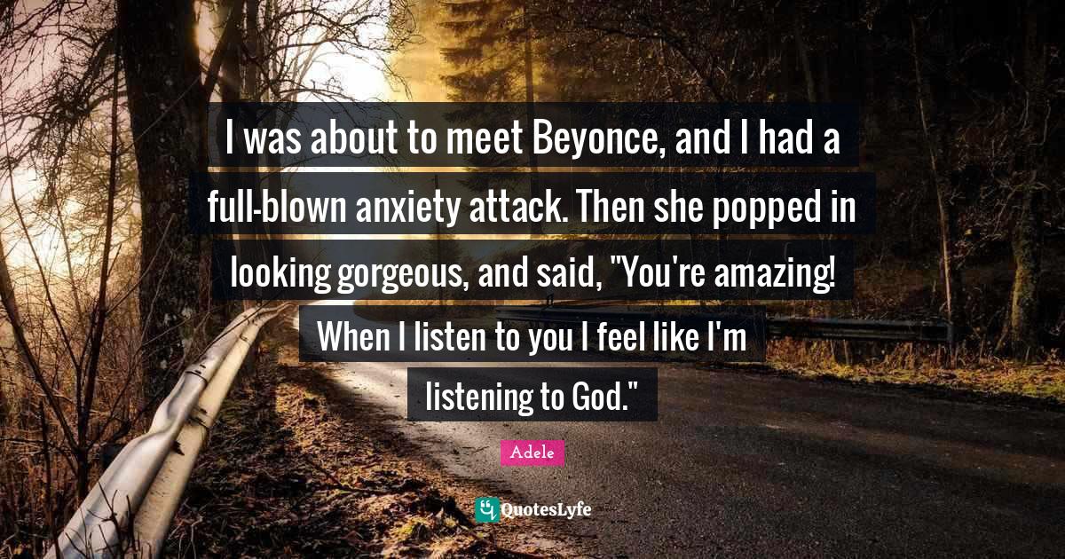 This page presents the quote "I was about to meet Beyonce, and I had a full-blown anxiety attack. Then she popped in looking gorgeous, and said, "You're amazing! When I listen to you I feel like I'm listening to God."". Author of this quote is Adele. This quote is about anxiety, said, gorgeous, listening, listening to god, beyonce,.