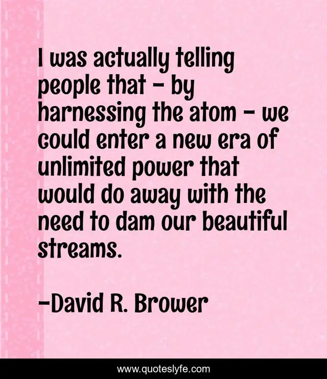 This page presents the quote "I was actually telling people that - by harnessing the atom - we could enter a new era of unlimited power that would do away with the need to dam our beautiful streams.". Author of this quote is David R. Brower. This quote is about beautiful, new, people,.