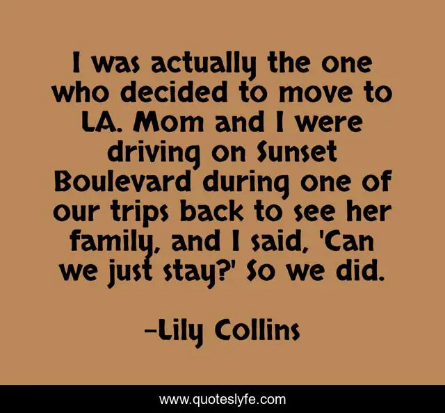 This page presents the quote "I was actually the one who decided to move to LA. Mom and I were driving on Sunset Boulevard during one of our trips back to see her family, and I said, 'Can we just stay?' So we did.". Author of this quote is Lily Collins. This quote is about see, sunset, family,.