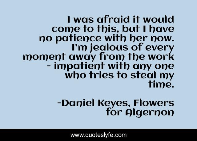 This page presents the quote "I was afraid it would come to this, but I have no patience with her now. I'm jealous of every moment away from the work - impatient with any one who tries to steal my time.". Author of this quote is Daniel Keyes, Flowers for Algernon. This quote is about love, jealousy, patience, moment, time, affection,.