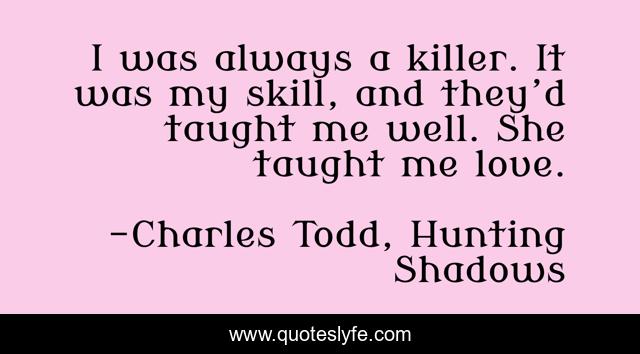 This page presents the quote "I was always a killer. It was my skill, and they’d taught me well. She taught me love.". Author of this quote is Charles Todd, Hunting Shadows. .