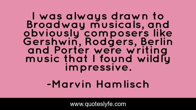 This page presents the quote "I was always drawn to Broadway musicals, and obviously composers like Gershwin, Rodgers, Berlin and Porter were writing music that I found wildly impressive.". Author of this quote is Marvin Hamlisch. This quote is about broadway, berlin, writing,.