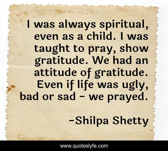 This page presents the quote "I was always spiritual, even as a child. I was taught to pray, show gratitude. We had an attitude of gratitude. Even if life was ugly, bad or sad - we prayed.". Author of this quote is Shilpa Shetty. This quote is about gratitude, life, sad,.