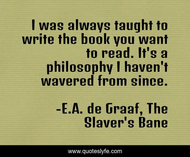 This page presents the quote "I was always taught to write the book you want to read. It's a philosophy I haven't wavered from since.". Author of this quote is E.A. de Graaf, The Slaver's Bane. This quote is about action-adventure, young-adult-fiction, fantasy-young-adult, writing-advice,.