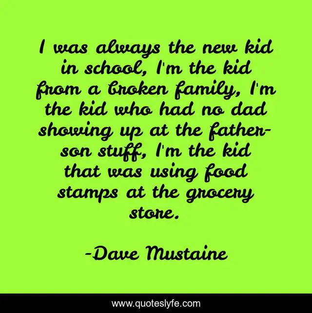 This page presents the quote "I was always the new kid in school, I'm the kid from a broken family, I'm the kid who had no dad showing up at the father-son stuff, I'm the kid that was using food stamps at the grocery store.". Author of this quote is Dave Mustaine. This quote is about food, school, family,.