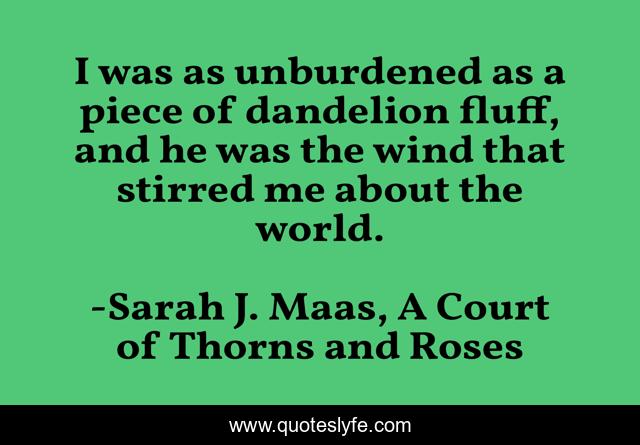 This page presents the quote "I was as unburdened as a piece of dandelion fluff, and he was the wind that stirred me about the world.". Author of this quote is Sarah J. Maas, A Court of Thorns and Roses. This quote is about new-adult, fantasy, feyre, romance, tamlin,.