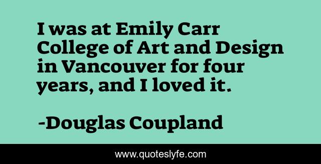 This page presents the quote "I was at Emily Carr College of Art and Design in Vancouver for four years, and I loved it.". Author of this quote is Douglas Coupland. This quote is about art, college, loved,.