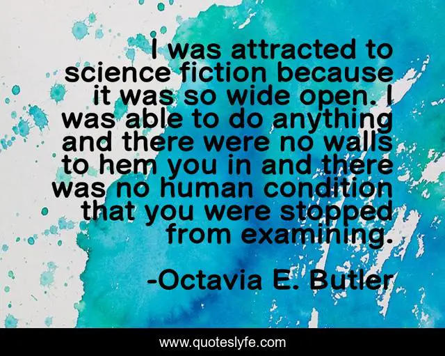 This page presents the quote "I was attracted to science fiction because it was so wide open. I was able to do anything and there were no walls to hem you in and there was no human condition that you were stopped from examining.". Author of this quote is Octavia E. Butler. This quote is about science-fiction, writing,.