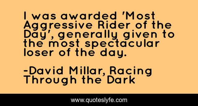 This page presents the quote "I was awarded 'Most Aggressive Rider of the Day', generally given to the most spectacular loser of the day.". Author of this quote is David Millar, Racing Through the Dark. This quote is about autobiography, racing-through-the-dark, cycling, david-millar, sports,.