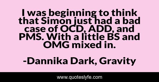 This page presents the quote "I was beginning to think that Simon just had a bad case of OCD, ADD, and PMS. With a little BS and OMG mixed in.". Author of this quote is Dannika Dark, Gravity. This quote is about funny, uf, humor, observation, dannika-dark, series, pnr, character, ocd,.