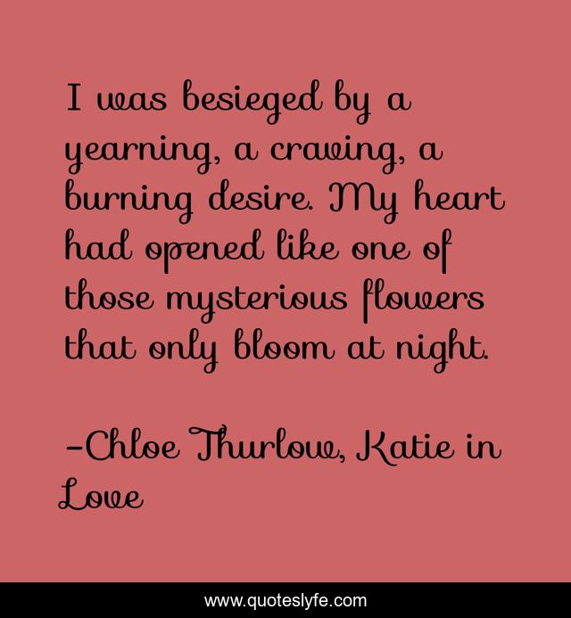 This page presents the quote "I was besieged by a yearning, a craving, a burning desire. My heart had opened like one of those mysterious flowers that only bloom at night.". Author of this quote is Chloe Thurlow, Katie in Love. This quote is about love, affection, love-hurts,.