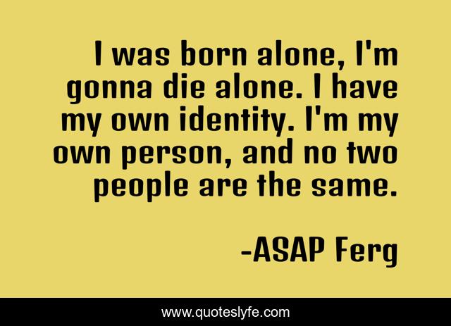 This page presents the quote "I was born alone, I'm gonna die alone. I have my own identity. I'm my own person, and no two people are the same.". Author of this quote is ASAP Ferg. This quote is about born, identity, people,.
