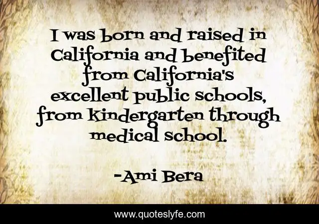 This page presents the quote "I was born and raised in California and benefited from California's excellent public schools, from kindergarten through medical school.". Author of this quote is Ami Bera. This quote is about born, school, california,.