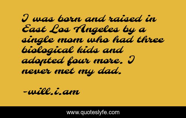 This page presents the quote "I was born and raised in East Los Angeles by a single mom who had three biological kids and adopted four more. I never met my dad.". Author of this quote is will.i.am. This quote is about born, kids, three,.