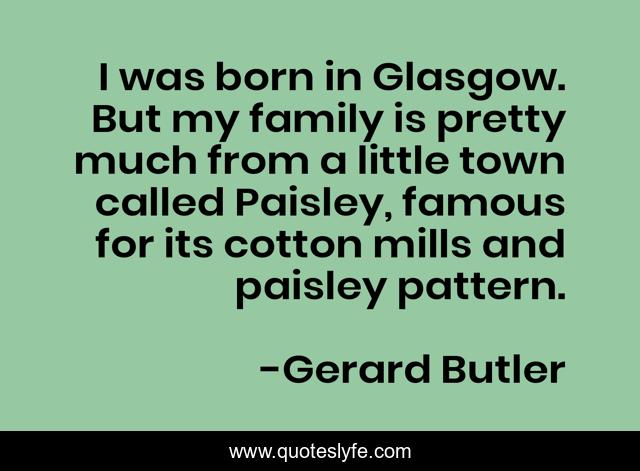 This page presents the quote "I was born in Glasgow. But my family is pretty much from a little town called Paisley, famous for its cotton mills and paisley pattern.". Author of this quote is Gerard Butler. This quote is about born, little, family,.