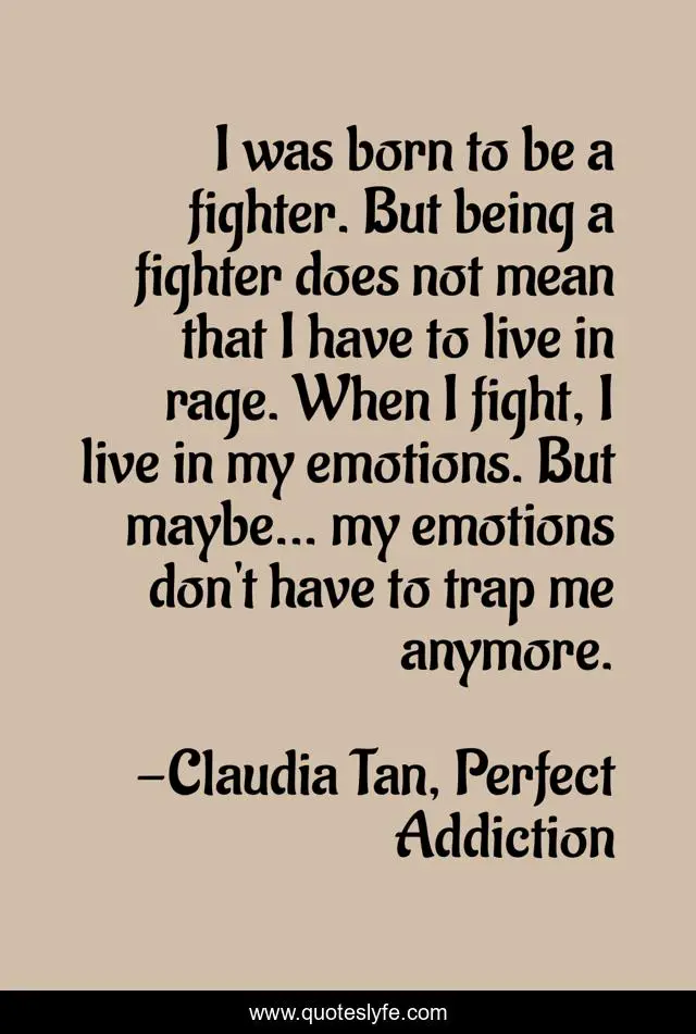 This page presents the quote "I was born to be a fighter. But being a fighter does not mean that I have to live in rage. When I fight, I live in my emotions. But maybe... my emotions don't have to trap me anymore.". Author of this quote is Claudia Tan, Perfect Addiction. This quote is about romance, fighter, claudia-tan, wattpad, perfect-addiction,.