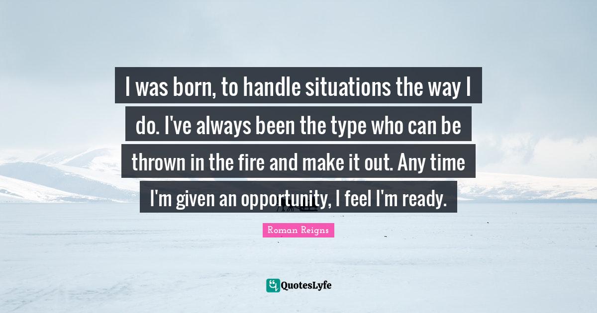 This page presents the quote "I was born, to handle situations the way I do. I've always been the type who can be thrown in the fire and make it out. Any time I'm given an opportunity, I feel I'm ready.". Author of this quote is Roman Reigns. This quote is about time, fire, given, way, type, thrown, ready, born, handle,.