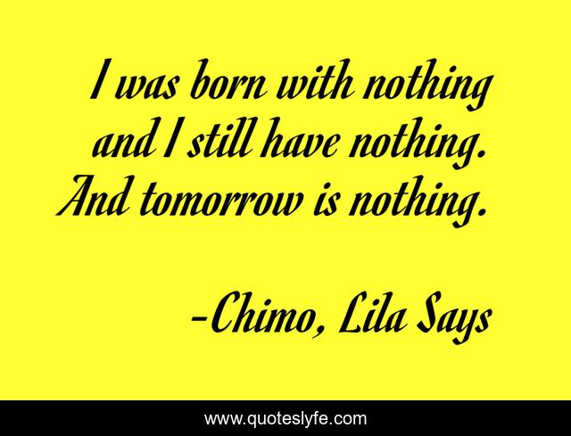 This page presents the quote "I was born with nothing and I still have nothing. And tomorrow is nothing.". Author of this quote is Chimo, Lila Says. This quote is about lila-says, nothing, life, chimo, hope,.