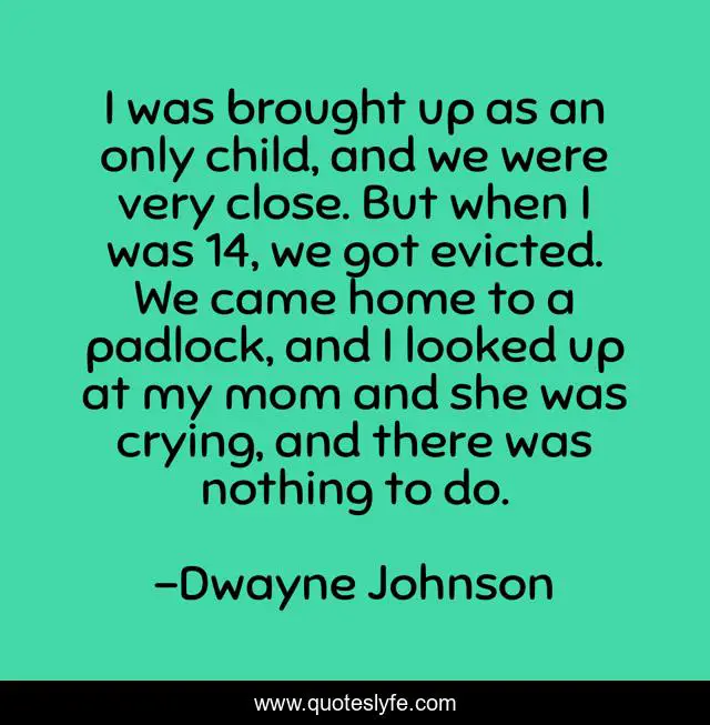 This page presents the quote "I was brought up as an only child, and we were very close. But when I was 14, we got evicted. We came home to a padlock, and I looked up at my mom and she was crying, and there was nothing to do.". Author of this quote is Dwayne Johnson. This quote is about home, she, child,.