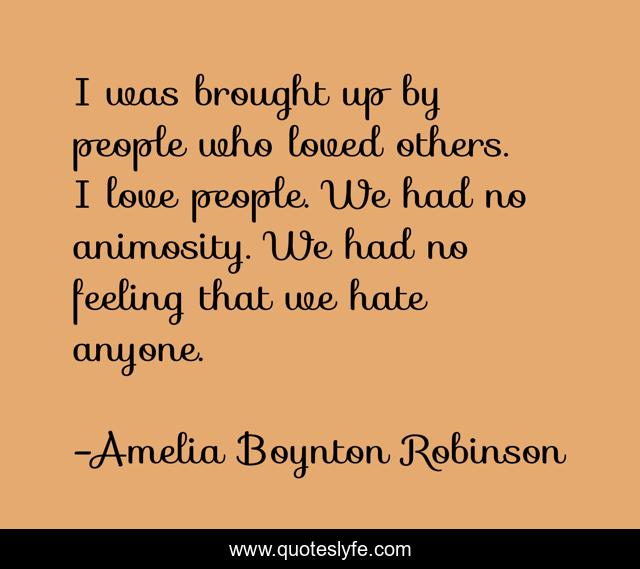 This page presents the quote "I was brought up by people who loved others. I love people. We had no animosity. We had no feeling that we hate anyone.". Author of this quote is Amelia Boynton Robinson. This quote is about civil-rights, love, brought-up, amelia-boynton, feeling, hate, humanity, affection, love-people,.