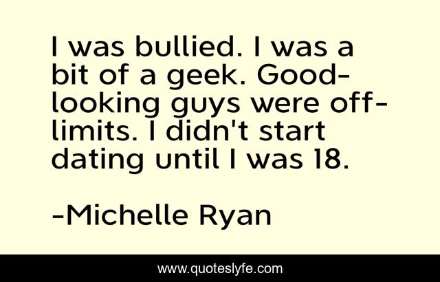 This page presents the quote "I was bullied. I was a bit of a geek. Good-looking guys were off-limits. I didn't start dating until I was 18.". Author of this quote is Michelle Ryan. This quote is about geek, start, good-looking,.