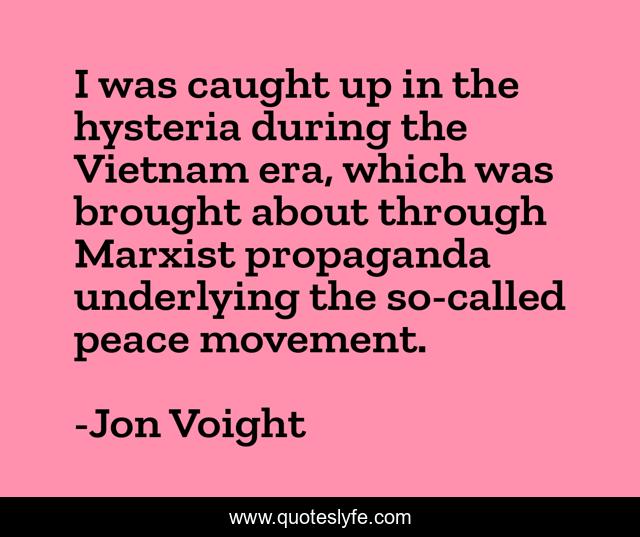 This page presents the quote "I was caught up in the hysteria during the Vietnam era, which was brought about through Marxist propaganda underlying the so-called peace movement.". Author of this quote is Jon Voight. This quote is about through, propaganda,.