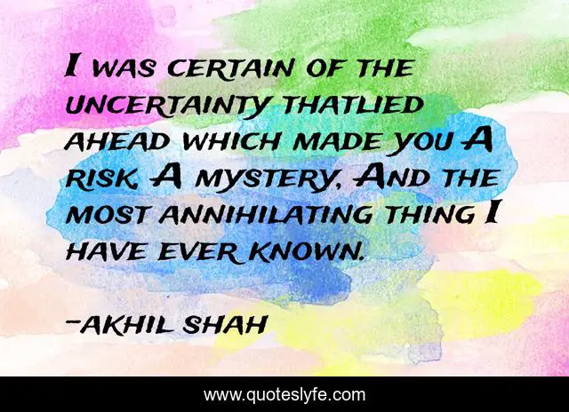 This page presents the quote "I was certain of the uncertainty thatlied ahead which made you A risk, A mystery, And the most annihilating thing I have ever known.". Author of this quote is akhil shah. This quote is about contemporary-romance, poetry,.