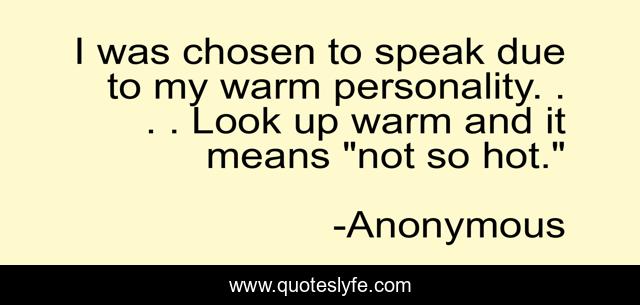 This page presents the quote "I was chosen to speak due to my warm personality. . . . Look up warm and it means "not so hot."". Author of this quote is Anonymous. This quote is about introductions, openers,.