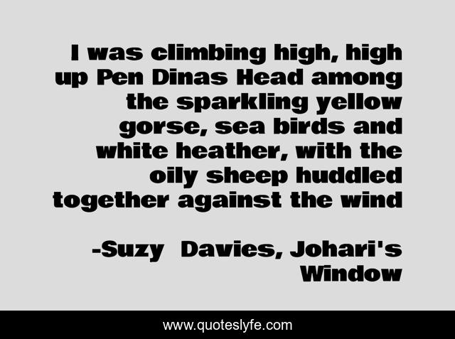This page presents the quote "I was climbing high, high up Pen Dinas Head among the sparkling yellow gorse, sea birds and white heather, with the oily sheep huddled together against the wind". Author of this quote is Suzy Davies, Johari's Window. .