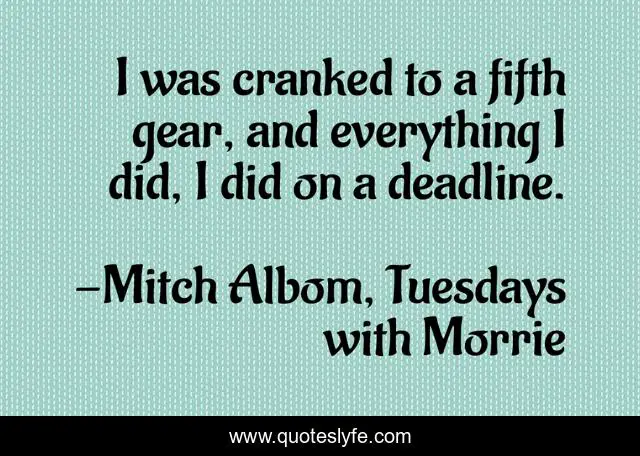 "Mitch Albom, Tuesdays with Morrie Quotes." Quoteslyfe.com, 2025. Mon. 08 Dec. 2025. <https://www.quoteslyfe.com/quote/I-was-cranked-to-a-fifth-gear-71945>.