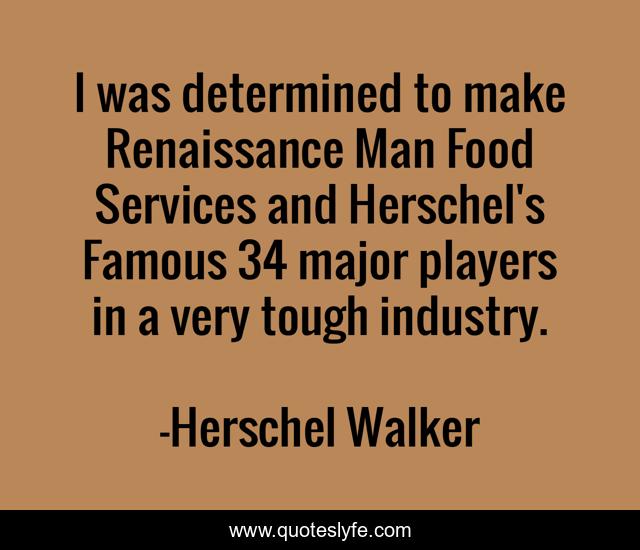 This page presents the quote "I was determined to make Renaissance Man Food Services and Herschel's Famous 34 major players in a very tough industry.". Author of this quote is Herschel Walker. This quote is about food, renaissance, man,.