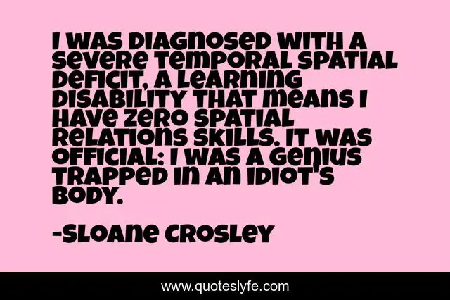 This page presents the quote "I was diagnosed with a severe temporal spatial deficit, a learning disability that means I have zero spatial relations skills. It was official: I was a genius trapped in an idiot's body.". Author of this quote is Sloane Crosley. This quote is about body, genius, disability,.