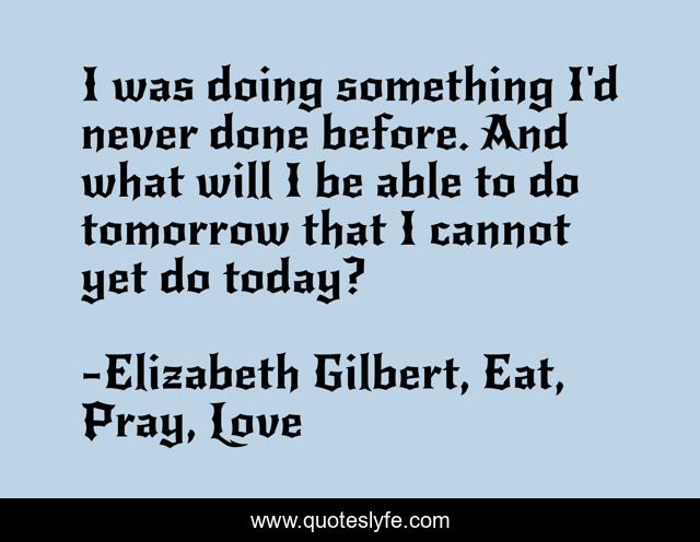 This page presents the quote "I was doing something I'd never done before. And what will I be able to do tomorrow that I cannot yet do today?". Author of this quote is Elizabeth Gilbert, Eat, Pray, Love. This quote is about future, ability,.